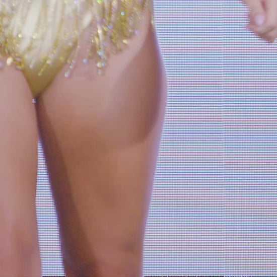 Own the shoreline. This statement two-piece shimmers with gold-tone chain fringe on both the halter top and the curve-hugging bottoms—made to sway and sparkle with every move. Perfect for beach clubs, festivals, and pool-party nights. ✨