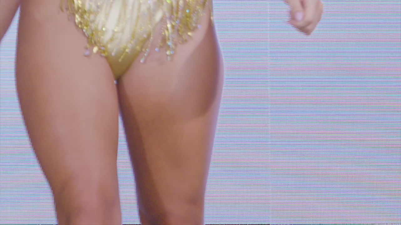 - Fabric: Stretch swim (nylon/spandex) with gold-tone chain embellishment
